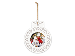 Decoración navideña en madera perforada color blanco, en forma de bola navideña, con imán, personalizable con una foto, para colgar, idea regalo original.
